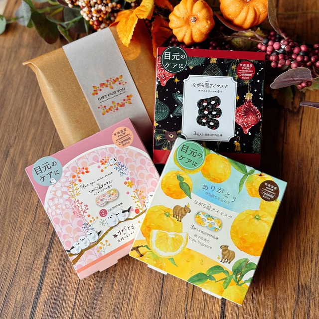 【ながらホットアイマスク3Pギフト】 スマホやPCで疲れた目をやさしく癒す、香り付きホットアイマスク3枚セット。 男女兼用で使える人気のプチギフトです。 「目を覆うタイプ」と「目が開いているタイプ」の2種類からお選びいただけます。 どちらも心地よい温度とやさしい香りで、贈る方にも贈られる方にも癒しの時間を届けます。 【目を覆うタイプ(おやすみ用)】 香りの専門家が監修した、上質なアロマの香り3種セット。 ・おやすみ前:ラベンダーの香り ・おやすみ前のホワイトムスク:ホワイトムスクの香り ・おやすみ羊:ひのきの香り 目もとをしっかり覆うタイプで、就寝前のリラックスタイムにおすすめです。 約40℃のやさしい温かさが約20分続き、 日中の疲れをじんわりと癒してくれます。 寝る前のリセット時間や、香りを楽しみたい方に最適です。 【目が開いているタイプ(ながら用)】 ・香り:ラベンダーのみ ・デザイン:うさぎ/くま/きつね のかわいい動物モチーフ 作業中やスマホ・読書タイムでも使える“ながら温感タイプ”。 目の部分が開いているので、仕事や勉強の合間にも使いやすい仕様です。 ほっとひと息つきたい時のリフレッシュにもおすすめ。 どちらのタイプも、約20分間(快適温度約40℃)の発熱が続き、 じんわりとした温もりで目もとを包み込みます。 自然な香りとともに、忙しい日常に癒しの時間をお届けします。 KOS-PLUSでは、すべての商品をスタッフが一つひとつ丁寧にラッピング。 届いてすぐにお渡しできる、完全オリジナルデザイン包装でお届けします。 納品書の同梱はなく、直送ギフトにも対応しているので安心です。 香りと温もり、かわいらしさを兼ね備えた人気の癒しギフト。 退職・送別・お礼・季節のご挨拶などにもぜひご利用ください。